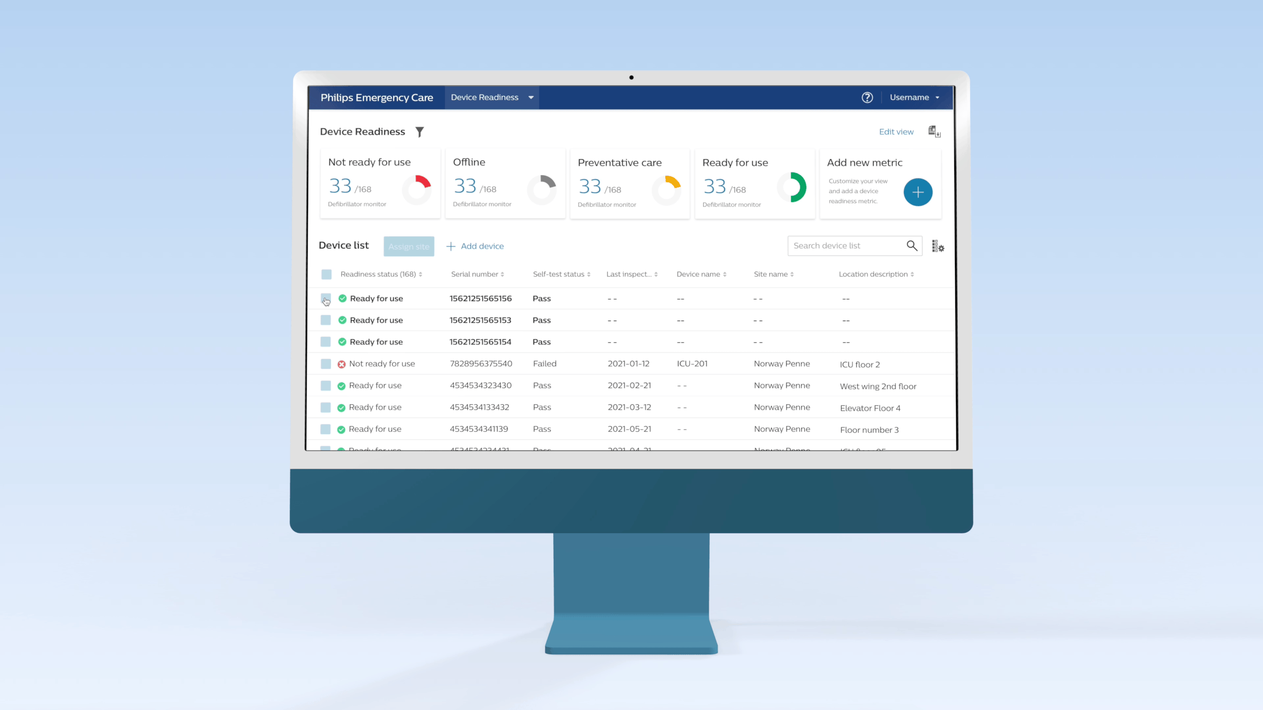 The user pain points was monitoring a mixed fleet of AED devices, remote monitoring, tracking readiness, and easy device setup. The challenge of designing a dashboard for both advanced and basic life support devices was tackled by enabling the addition and sorting of devices based on type, location, and status, allowing users to easily view and manage all devices in one comprehensive view.